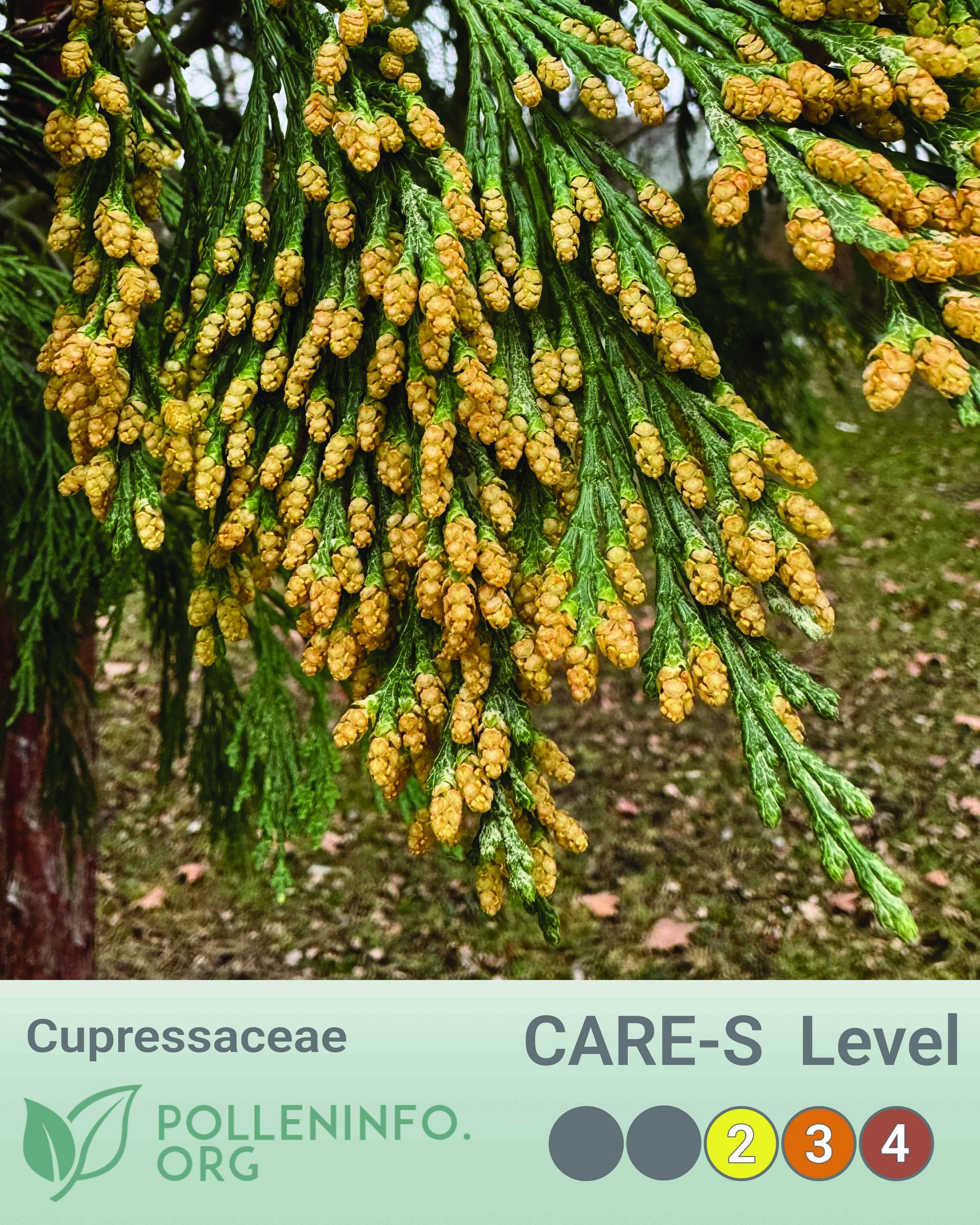 Allergie Potenzial — CARE-S* Level 4 (Allergen Cry j1). Wuchsform — Baum. Belaubung — Immergrüne Nadeln. Fortpflanzung — Windbestäubt. Standorte — Als Zierpflanze oder in Parkanlagen, ursprüngliche Heimat Japan, hier ist eines der Hauptallergene. Blüte in Mitteleuropa — Februar bis Anfang April.